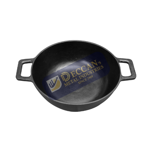 Ideal for small households or single servings, the Cast Iron Oval Kadhai 7″ is a small yet incredibly useful piece of cookware. Its superior cast iron construction provides equal heat distribution and outstanding heat retention, improving the taste and texture of your food. Its oval design adds a fashionable touch while enabling efficient cooking, making it perfect for frying, sautéing, and boiling. It creates a naturally non-stick surface for healthier dishes when properly seasoned. The kadhai has strong handles for safe holding and is suitable for gas, induction, and oven use. It is a classic and long-lasting need for both modern and traditional kitchens.